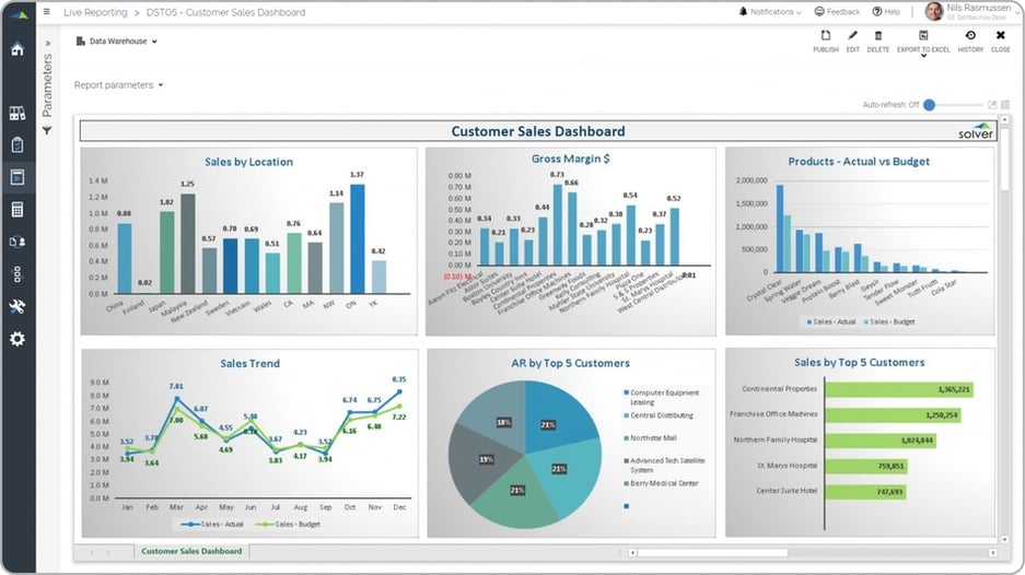 What is a Customer Sales Dashboard for a Distribution Company? Customer sales dashboards are considered market analysis tools and are used by sales executives to analyze sales performance metrics. Some of the main functionality in this type of dashboard is that it provides six visualizations for KPI analysis: 1) Sales by sales manager, 2) Gross margin by product, 3) Actual versus budgeted product sales, 4) Monthly revenue trend, 5) Accounts receivable (AR) by customer, and 6) Top 5 customer sales. You find an example of this type of dashboard below.