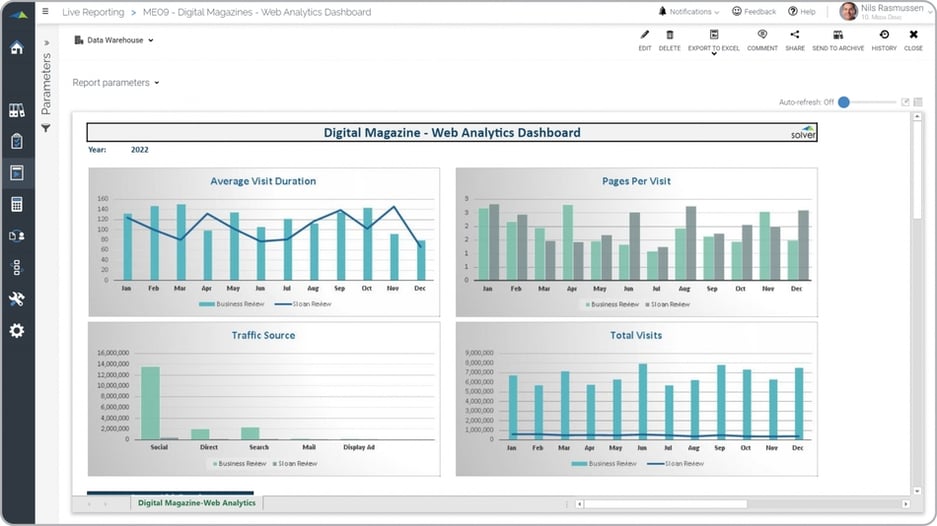 What is a Digital Media Web Analytics Dashboard? Web Analytics Dashboards are considered operational analysis tools and are used by marketing and web-site managers to analyze trends and anomalies in web visitor metrics. Some of the main functionality in this type of dashboard is that it provides monthly trend analysis per online publication. The example has four different perspectives: 1) Average visitor duration, 2) Visitors per traffic source, 3) Pages per visit, and 4) Total visits. You find an example of this type of dashboard below.