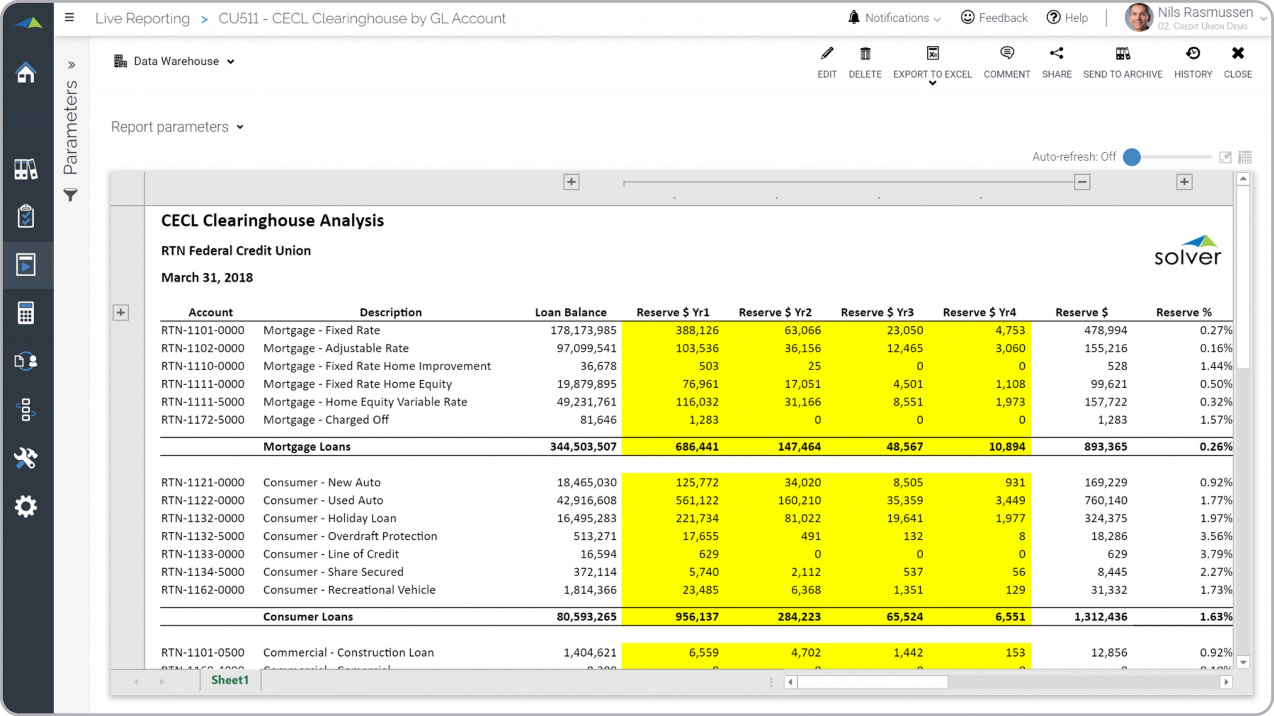 What is a n Analysis by Account Report? Analysis by Account Reports are considered Current Expected Credit Losses (CECL) reports and are used by accountants and compliance managers to support them in their CECL reporting. Some of the main functionality in this type of report is that it can be run for any quarter (or month) and the rows list credit and loan products by account, including: Mortgage loans, consumer loans, commercial loans, credit cards, as well as a grand total. The columns show Loan balance, Annual reserves, Total reserves (amount) and Reserves (%). You find an example of this type of report below.