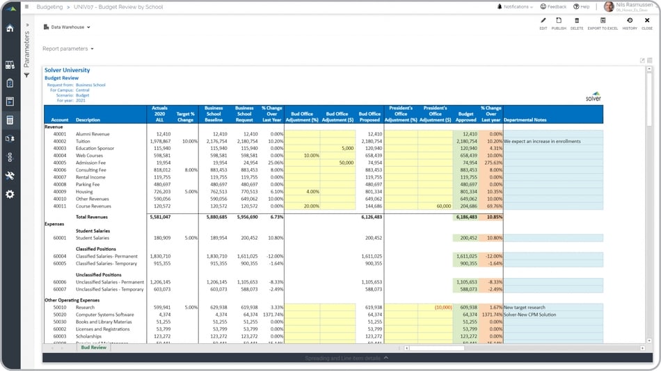What is a Budget Review and Adjustments Template? Annual Budget Review and Adjustments templates are considered management input forms and are often used by the budget manager and the president's office to review departmental budgets and make final adjustments and comments. Key functionality in this type of input form shows the requested revenues and expenses for a department/school and then allows for adjustments. The budget manager and the president's office have separate input and comment columns leading up to the final approved budget. The bottom (not visible in the screenshot below) of the template displays the net surplus or deficit. You will find an example of this type of input form below.