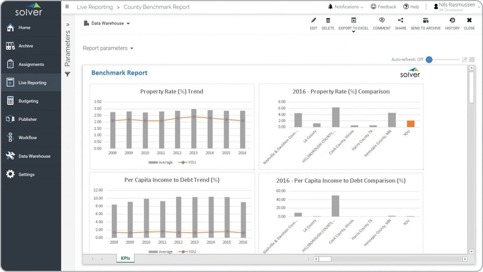 What is a KPI Benchmark Report? KPI Benchmark Reports and Dashboards are considered strategic decision-support tools and are used by Executives and Planners to analyze how their institution is performing compared to other similar public sector organizations. Some of the main functionality in this type of comparative report is that it can include any type of benchmark metric for any number of years. In the example below there are four benchmark KPIs: 1) Annual trend in property rates compared to the benchmark average, 2) Current year property rate compared to selected other governments, 3) Per capita income to debt annual trend compared to the benchmark average, and 4) Per capita income to debt compared to selected governments. Any other publicly available information can be used as KPIs in this benchmark report. You find an example of this type of comparative report below.