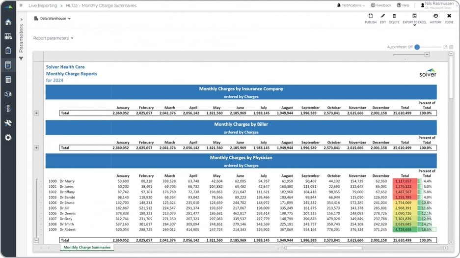 What is a Monthly Charges Summary Report? Monthly charges reports are considered important reports for healthcare organizations and are used by CFOs, accountants and revenue officers to analyze all monthly charges. Some of the main functionality in this type of analytical summary report is that it can be filtered by biller, insurance provider and physician. Across the columns you find all 12 months of the year as well as a total and how much (%) each row is of the total amount. Downwards in the report there are four sections: 1) Metrics by insurance company, 2) Metrics by biller, 3) Metrics by physician, 4) Metrics by revenue group. At the bottom each section you find sub-totals. You find an example of this type of analytical summary report below.