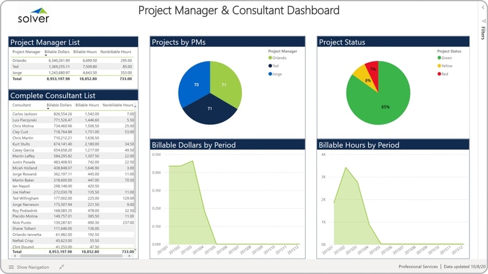 Purpose of Project Dashboards Professional service organizations use Project Dashboards to gives consulting leaders an easy way to understand how project managers, consultants and projects are performing. When used as part of good business practices in Financial Planning & Analysis (FP&A) and Consulting departments, an organization can improve its decision speed as it relates to projects and professional resources, and it can reduce the chances that poor performance goes undetected with likely resulting loss in revenues.