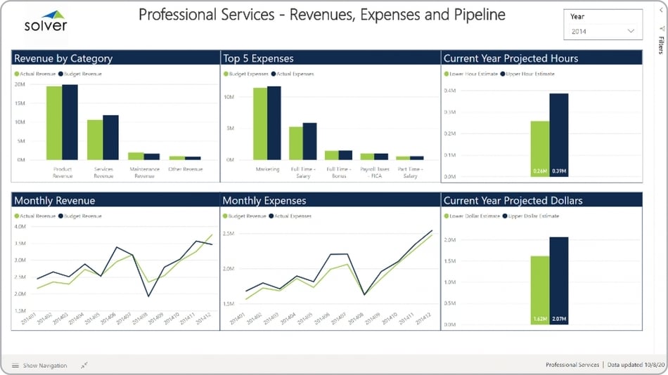 Purpose of Revenue and Expense Analysis Dashboards Professional services organizations use Revenue and Expense Analysis Dashboards to provide executives with a one page overview of key financial figures as well as a pipeline outlook for hours delivered. When used as part of good business practices in Financial Planning & Analysis (FP&A) departments, an organization can improve its strategic decisions and profitability, and it can reduce the chances that decision-makers are missing the big picture.