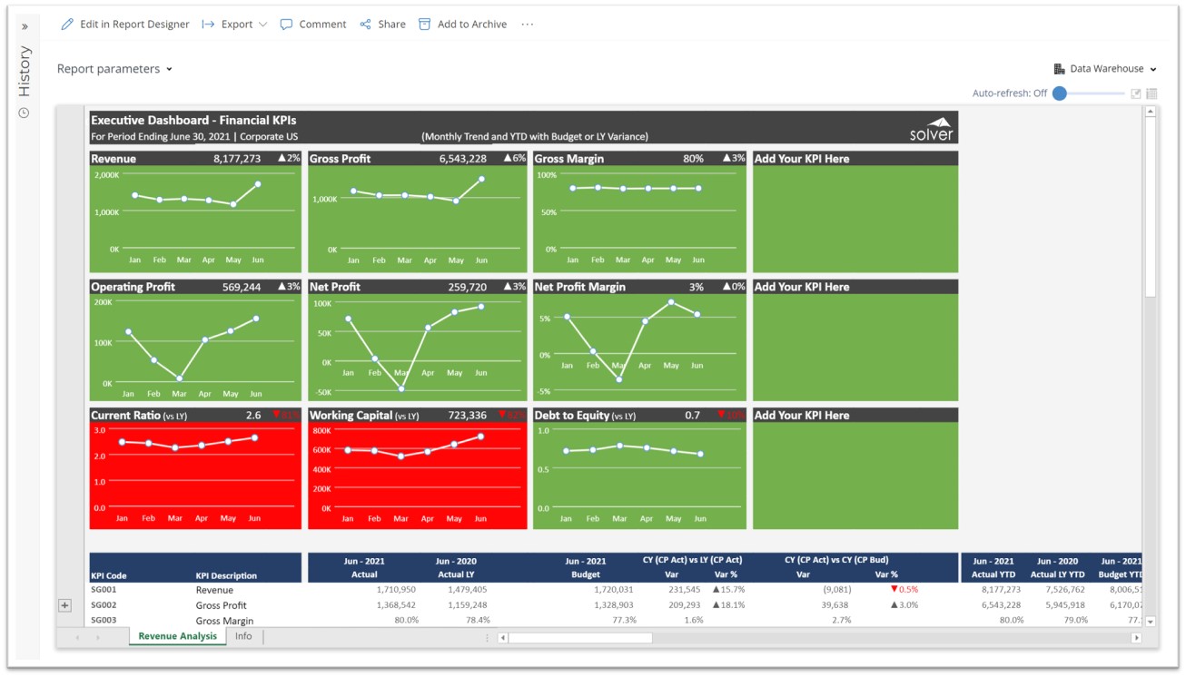 The Executive Dashboard with Financial KPIs is a ready-to-use Dashboards and Scorecards from the Solver Marketplace.