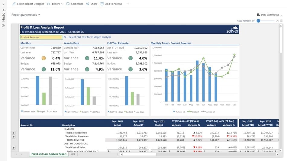 The Profit & Loss Analysis Report with Interactive Analysis is a ready-to-use template from the Solver Marketplace.