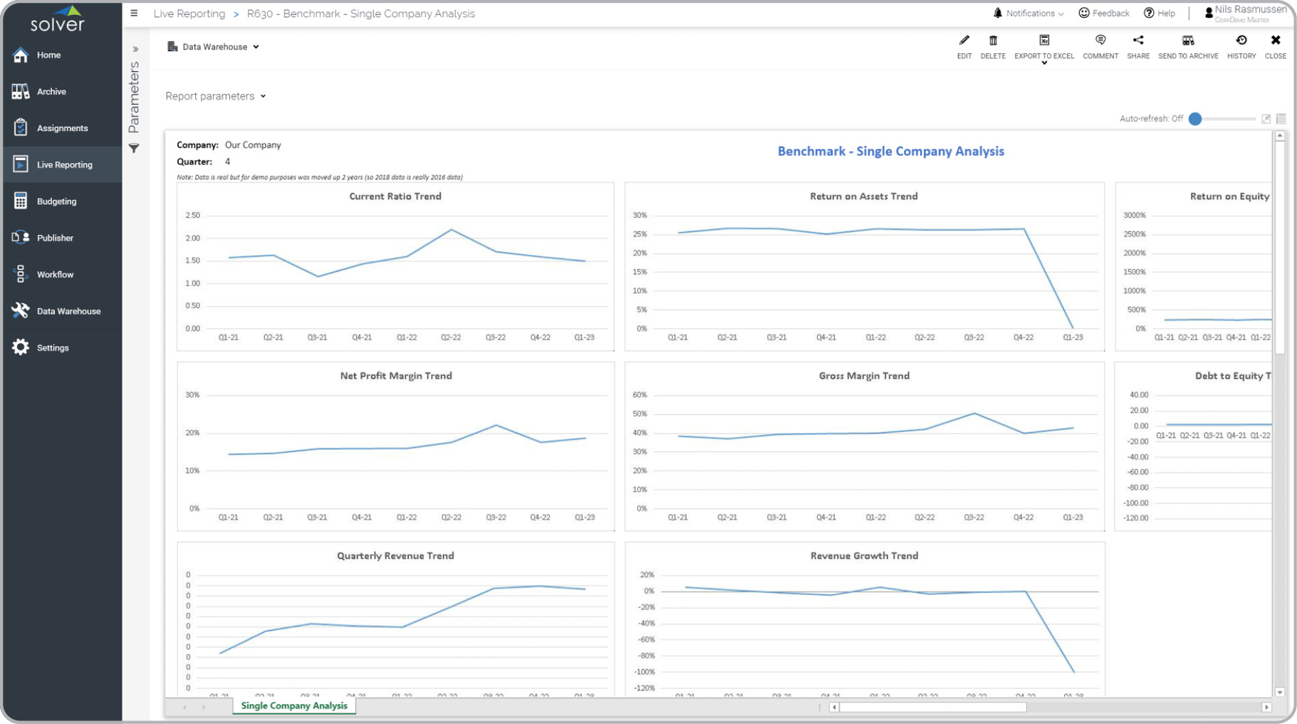 What is a Competitor Trend Analysis Report? Competitor analysis reports are considered benchmarking tools and are often used by CFOs, executives and analysts to track the performance and trends of similar or competing organizations. Some of the key functionality in this type of KPI benchmark report is that it is based on available data from competitors. Often, this is data from a web-site like Yahoo Finance or a government web-site like Edgar. The example consists of eight charts, each one displaying the trend for a specific metric for the past eight quarters. The metrics include: Current Ratio, Return on Assets, Return on Equity, Profit Margin, Gross Margin, Debt to Equity, Revenue and Revenue Growth. You find an example of this type of KPI benchmark report below.