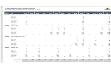 Tracks 13 months of rolling equipment maintenance activity including repair costs, maintenance frequency, and downtime by equipment type and location, enabling operators to identify aging equipment and predict maintenance needs proactively.
