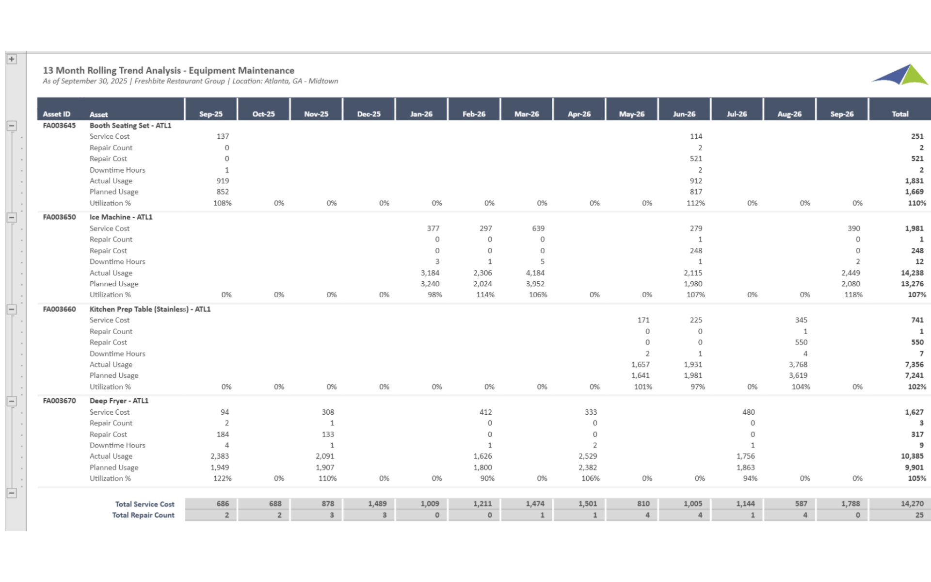 Retail - Restaurant – 13 Month Rolling Trend Analysis – Equipment Maintenance