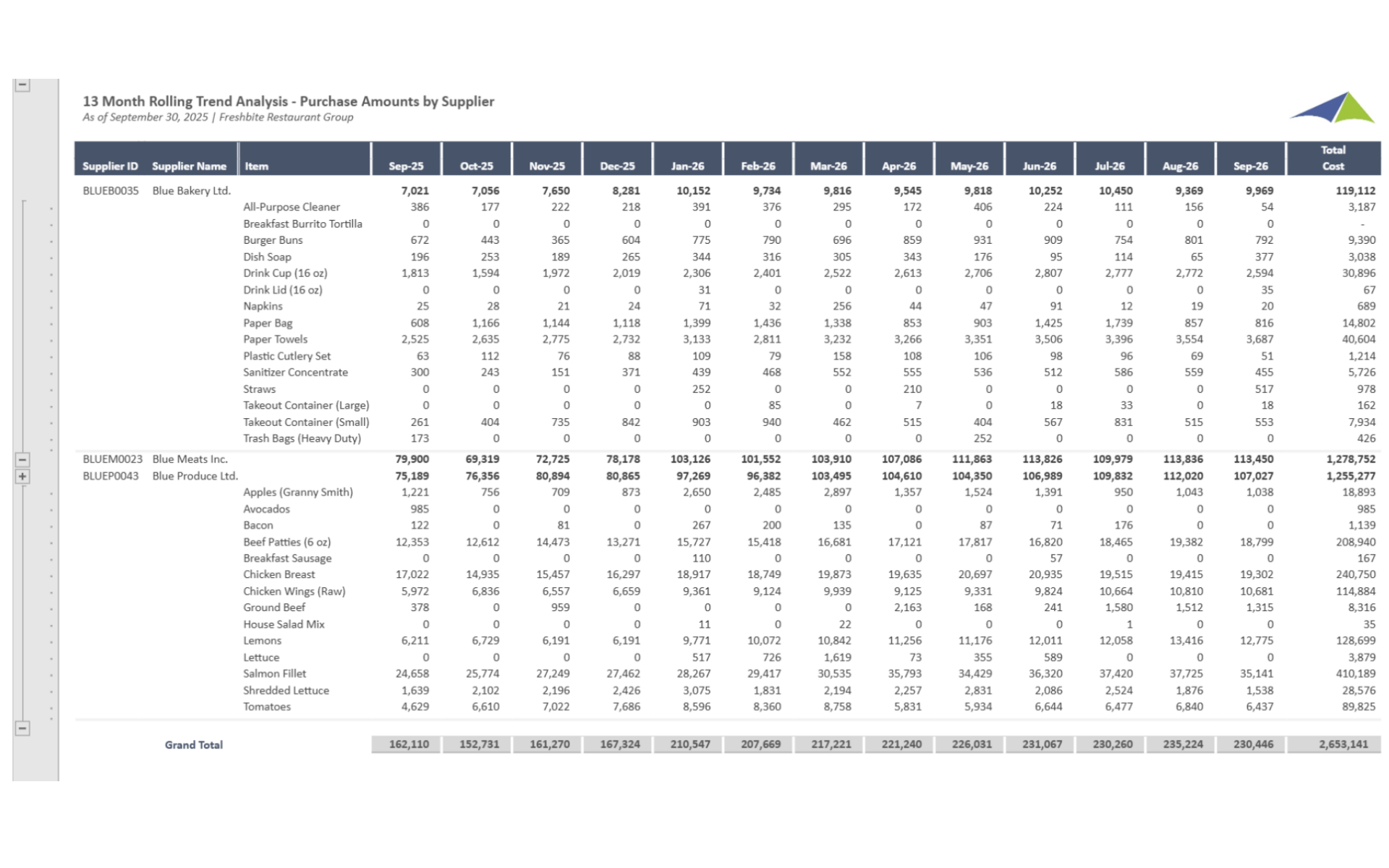 Tracks 13 months of rolling purchase order amounts by supplier across all locations, enabling procurement teams to monitor supplier spending trends, identify concentration risk, and optimize purchasing across the restaurant portfolio.