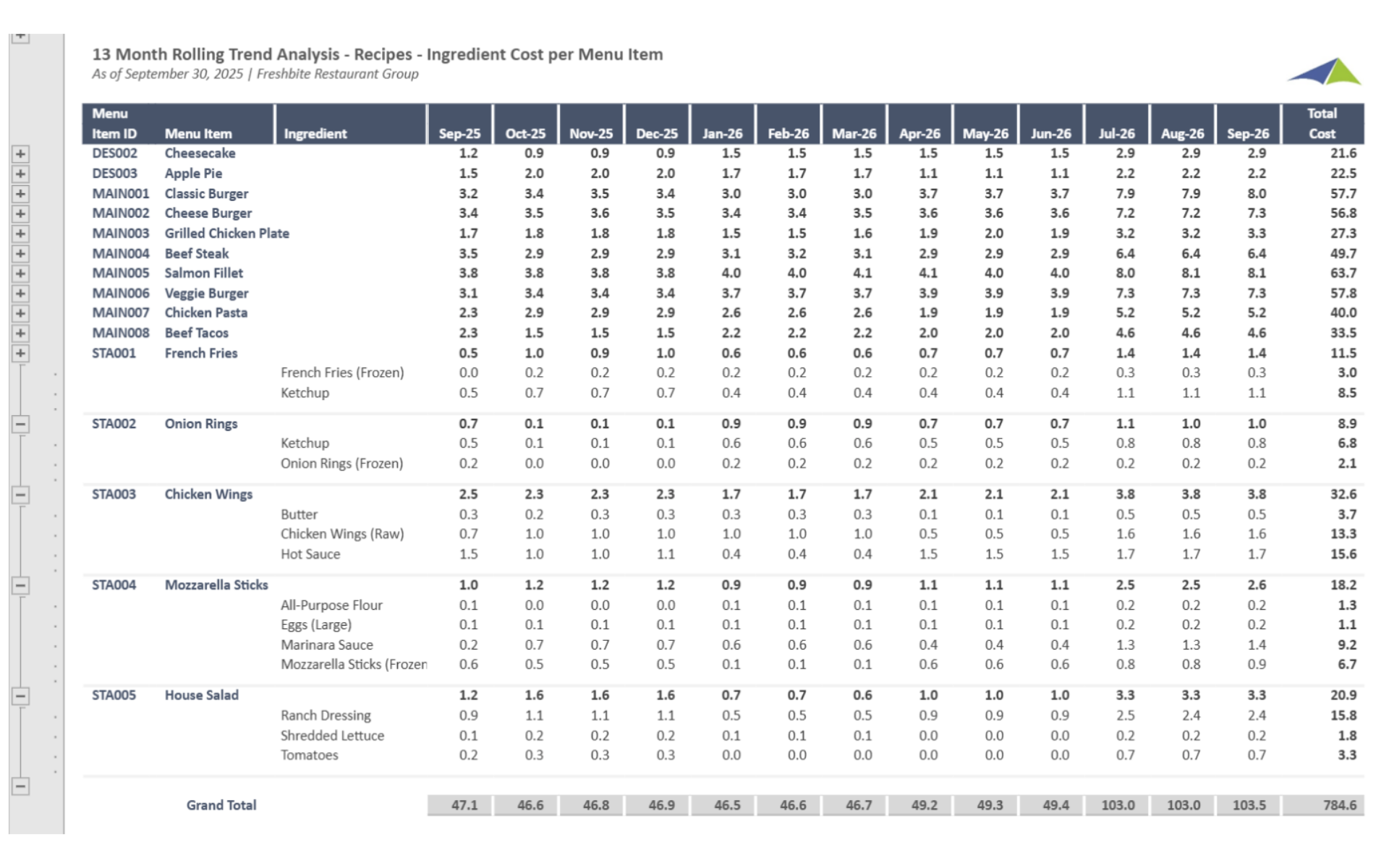 Tracks 13 months of rolling recipe cost trends by menu item, enabling culinary and finance teams to monitor how ingredient cost changes impact cost per menu item and identify items trending out of acceptable ranges.