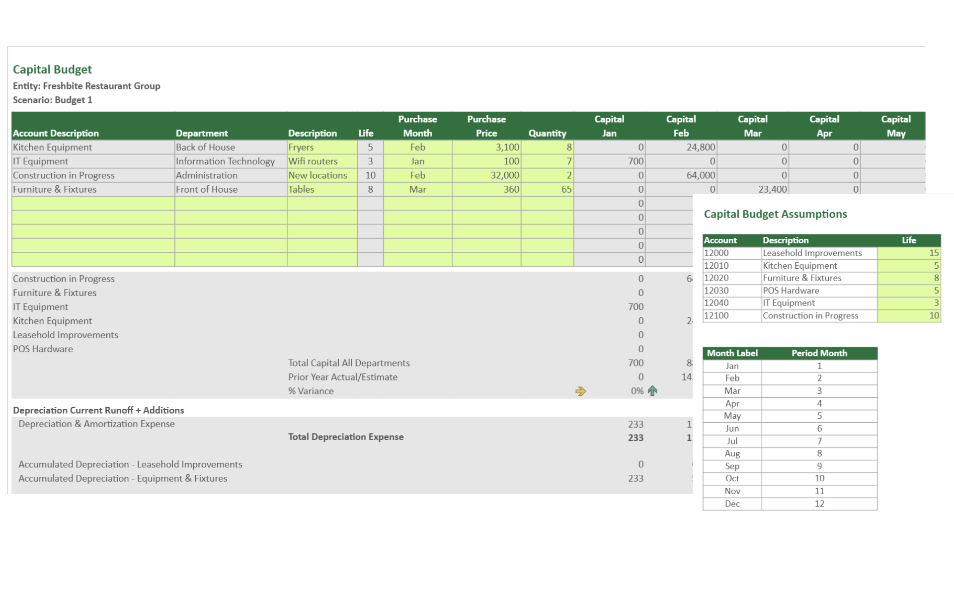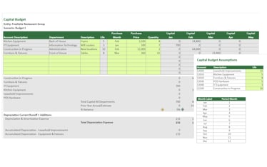 Designed for multi-location restaurant groups, it enables finance teams to plan capital expenditures by asset type, location, and purchase month, with integrated depreciation calculations that automatically flow through to the P&L and balance sheet budget for a fully linked three-statement capital plan. Built for multi-location restaurant groups in the retail industry, this Solver planning template connects CapEx budget data to P&L and balance sheet models via the Solver Data Warehouse. Designed for QuickStart deployment, it supports annual capital planning, equipment replacement cycles, and new unit build-out investment decisions.