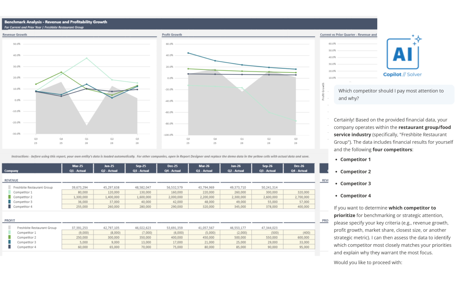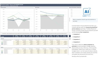 The Retail - Restaurant – Dashboard – Benchmark Analysis in Solver is a pre-built xFP&A dashboard template in the Solver Template Marketplace for the retail industry.