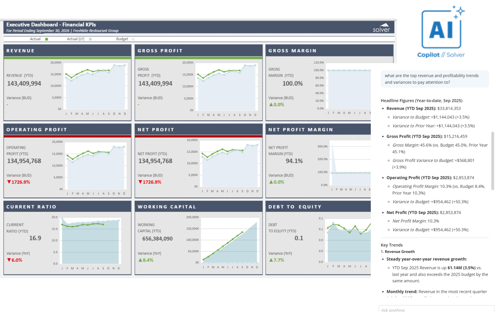 The Retail - Restaurant – Executive Dashboard – Financial KPIs in Solver is a pre-built xFP&A dashboard template in the Solver Template Marketplace for the retail industry.