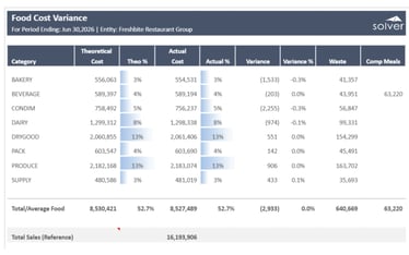 Designed for multi-location restaurant groups, it analyzes food cost variance by location, category, and period — comparing actual food costs to theoretical (recipe-based) costs and budget — helping operators identify waste, theft, portioning errors, and supplier pricing issues driving cost overruns. Built for multi-location restaurant groups in the retail industry, this Solver report connects inventory, recipe, and POS data via the Solver Data Warehouse, delivering near real-time food cost variance analysis. Designed for QuickStart deployment, it supports weekly and monthly food cost reviews and waste reduction initiatives.