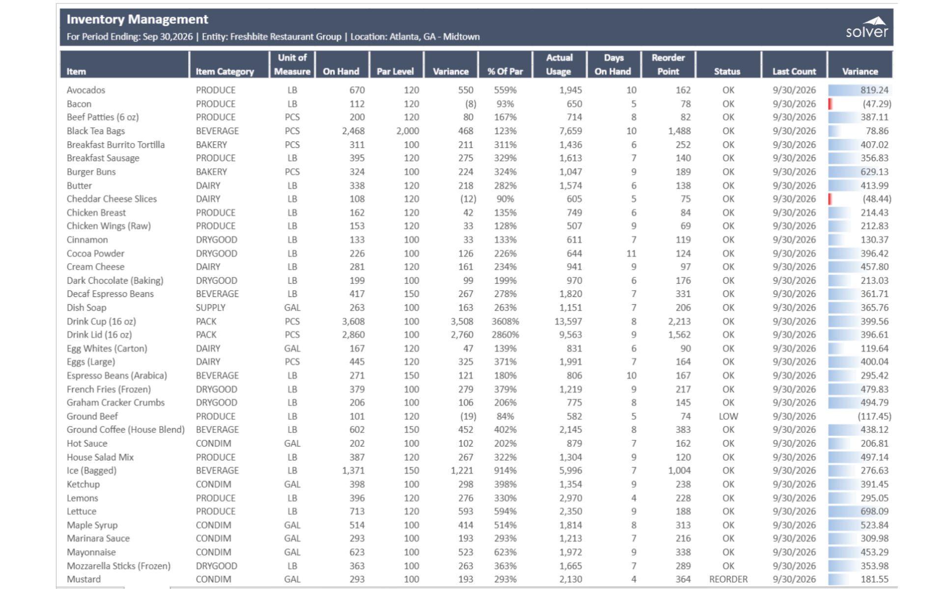 Designed for multi-location restaurant groups, it provides a comprehensive view of inventory levels, usage, waste, and variance by item and location — enabling operators to reduce food waste, optimize par levels, and ensure supply chain efficiency across the restaurant portfolio. Built for multi-location restaurant groups in the retail industry, this Solver report connects inventory management system data via the Solver Data Warehouse, delivering near real-time inventory analysis across all locations. Designed for QuickStart deployment, it supports weekly inventory reviews and waste reduction programs.