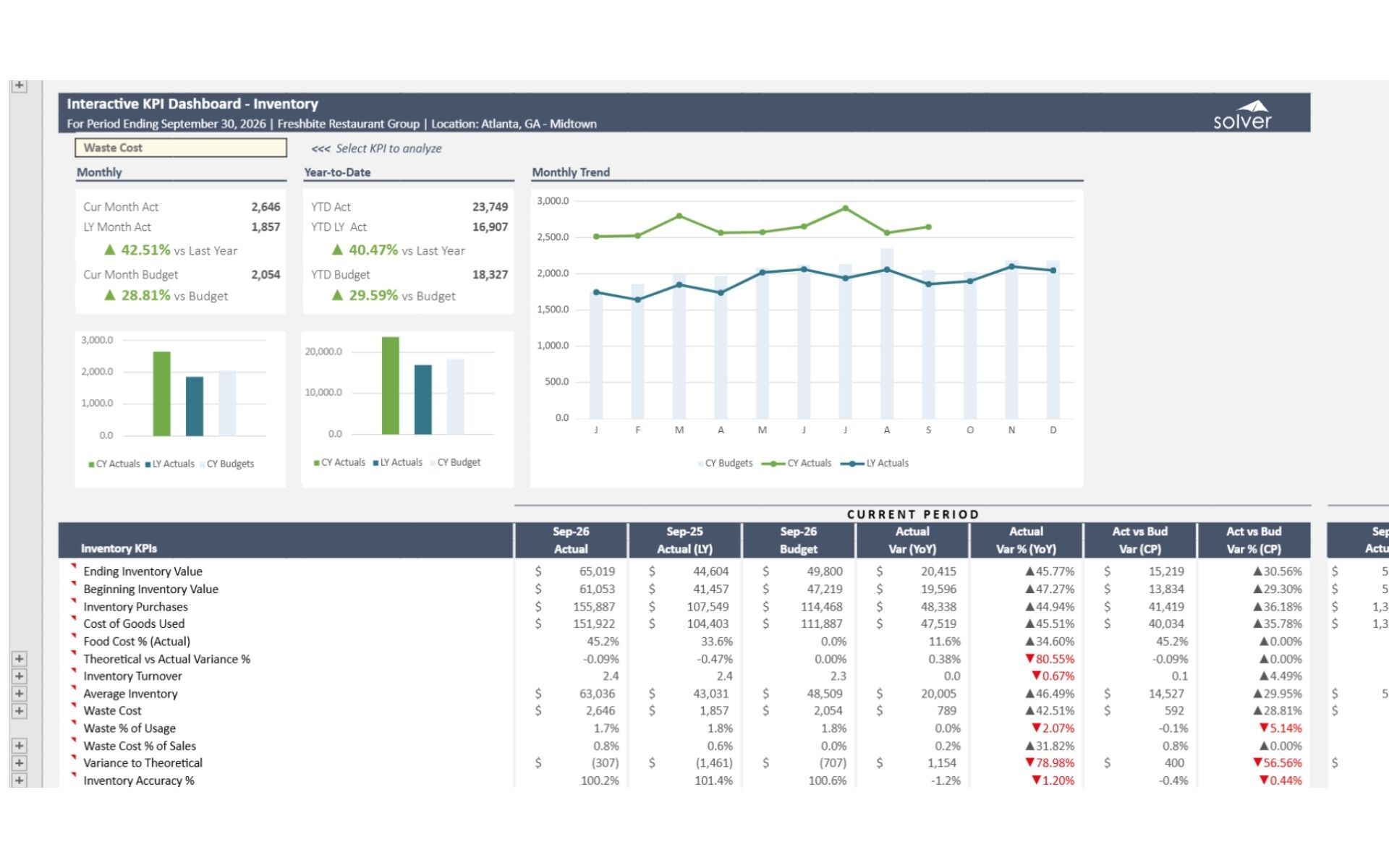 Built for multi-location restaurant groups in the retail industry, this Solver dashboard connects inventory management system data via the Solver Data Warehouse, delivering near real-time inventory performance monitoring. Designed for QuickStart deployment, it supports weekly inventory reviews.