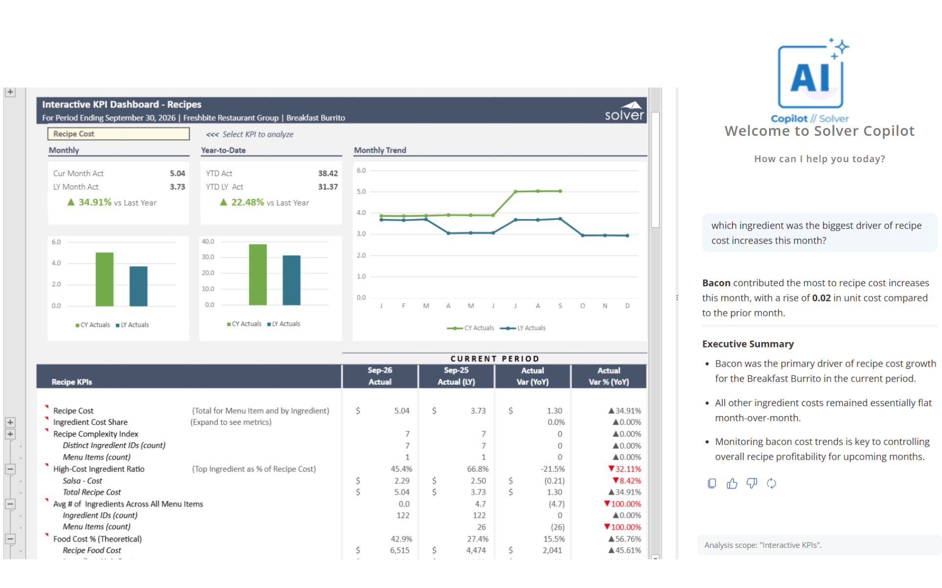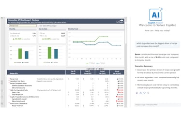 Designed for multi-location restaurant groups, it combines interactive recipe-level KPI analysis with Solver Copilot AI-generated insights — enabling operators to analyze menu item costs, margins, and usage trends while receiving natural language commentary that highlights key findings automatically. Built for multi-location restaurant groups in the retail industry, this Solver dashboard connects recipe, POS, and cost data via the Solver Data Warehouse, delivering near real-time menu performance insights with AI narrative support from Solver Copilot. Designed for QuickStart deployment, it accelerates menu engineering and cost control decisions across the full restaurant portfolio.
