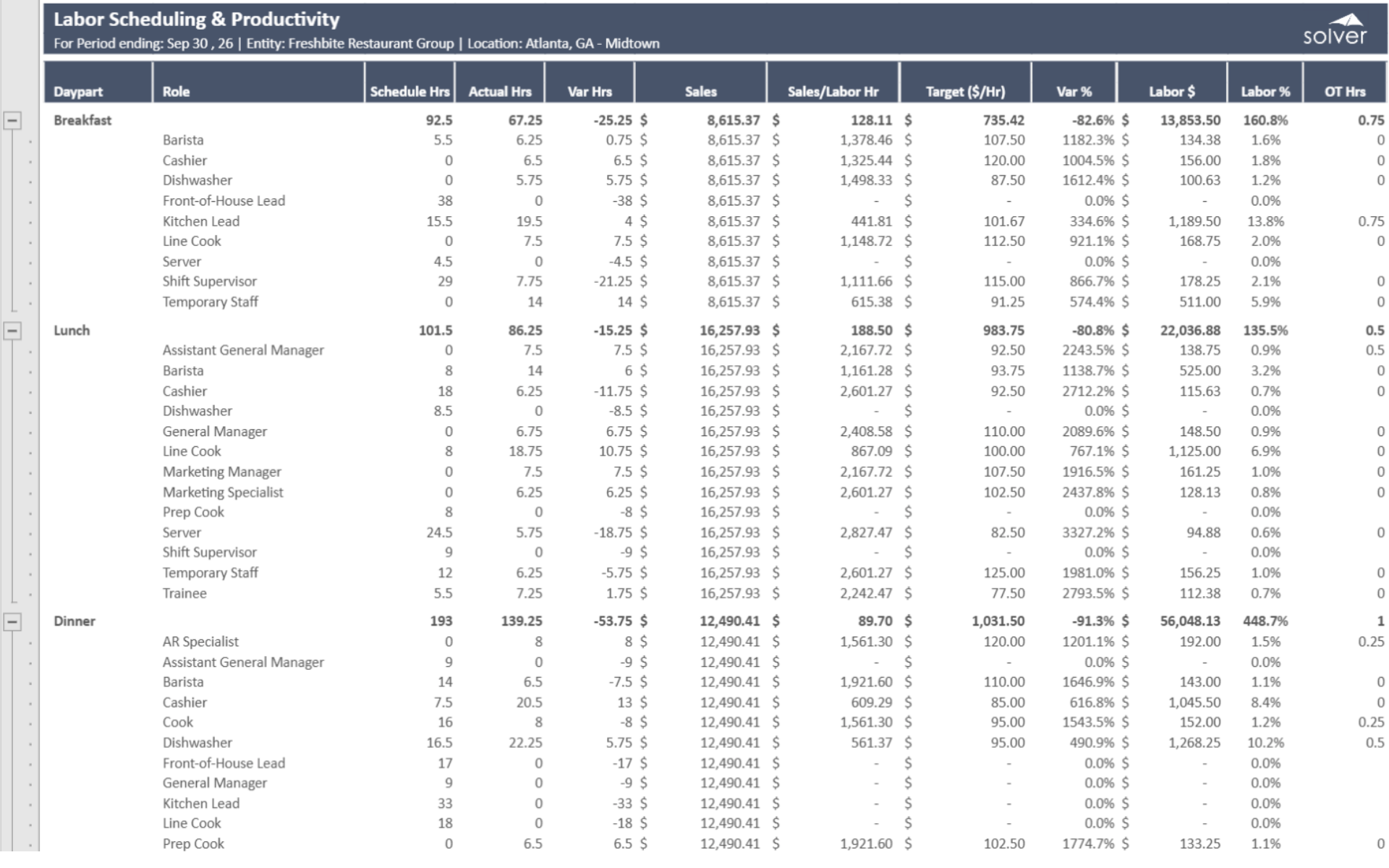 Built for multi-location restaurant groups in the retail industry, this Solver report connects labor scheduling and POS data via the Solver Data Warehouse, delivering integrated labor productivity analysis. Designed for QuickStart deployment, it supports weekly labor efficiency reviews.