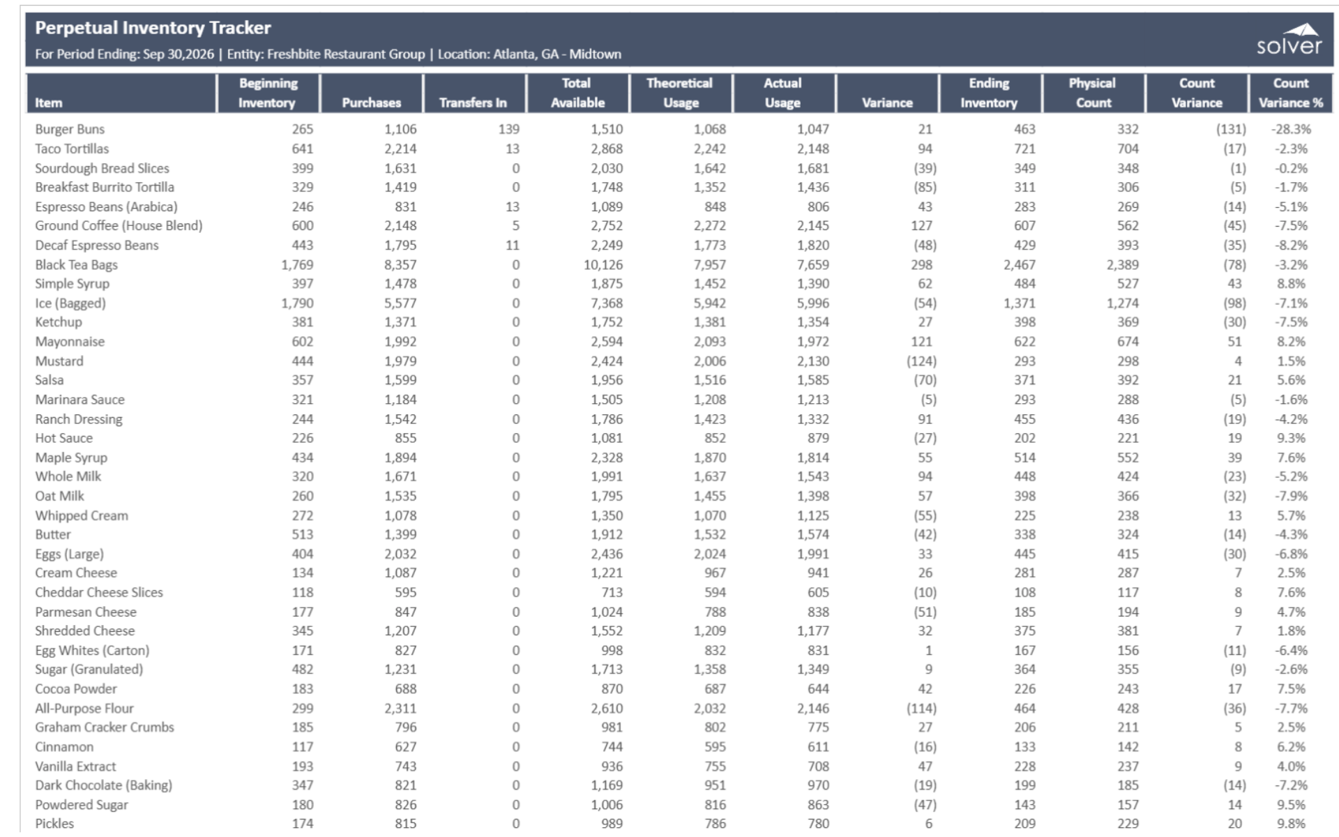 Designed for multi-location restaurant groups, it maintains a continuously updated inventory position by tracking every receipt and usage transaction as it occurs — giving operators a real-time picture of on-hand inventory values, theoretical usage, and actual consumption at each location without relying on periodic physical counts. Built for multi-location restaurant groups in the retail industry, this Solver report connects inventory and POS transaction data via the Solver Data Warehouse, delivering a perpetual inventory view that updates continuously. Designed for QuickStart deployment, it reduces the frequency and cost of physical counts.