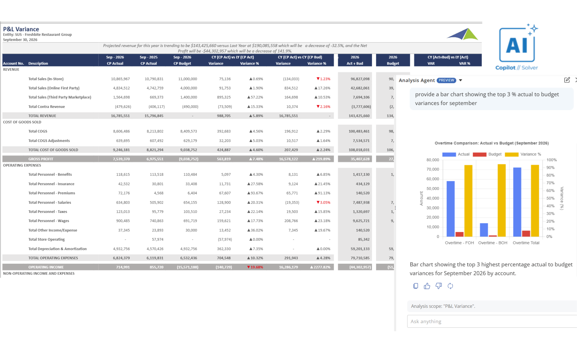 Designed for multi-location restaurant groups, it delivers a detailed Profit & Loss variance report comparing actual results to budget with expandable GL account rows, monthly and YTD columns, and an AI-generated narrative from Solver Copilot that automatically summarizes the key variances. Built for multi-location restaurant groups in the retail industry, this Solver report connects to your ERP and accounting data via the Solver Data Warehouse, enabling near real-time P&L variance analysis at the location, region, or consolidated group level. Designed for QuickStart deployment, it replaces manual spreadsheet-based P&L reporting with a self-service, parameter-driven solution.