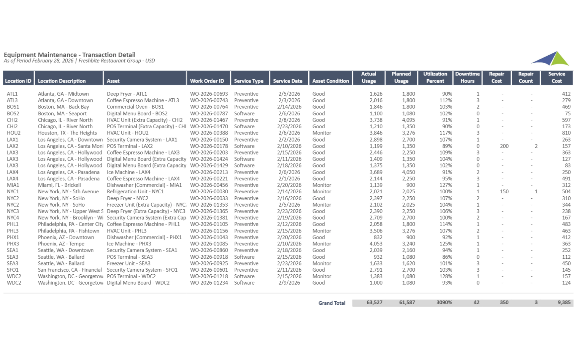 Built for multi-location restaurant groups in the retail industry, this Solver report connects maintenance management system data via the Solver Data Warehouse, delivering work-order-level equipment maintenance detail. Designed for QuickStart deployment, it supports facilities management and vendor accountability.