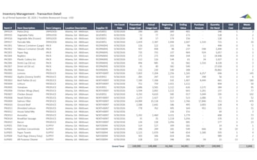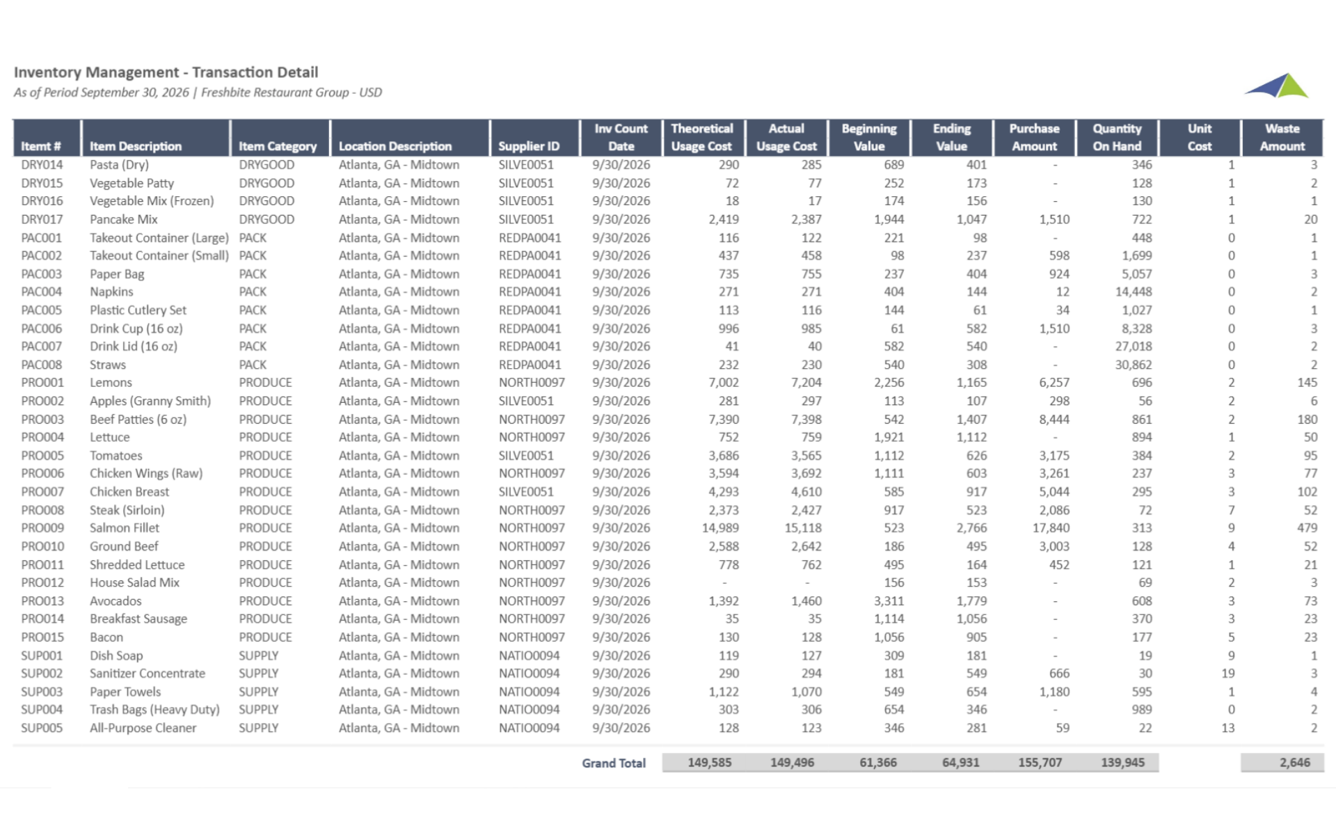 Provides line-level inventory transaction detail including receipts, usage, waste, and adjustments by item and location enabling supply chain and finance teams to audit inventory movements and investigate discrepancies between physical counts and system records.