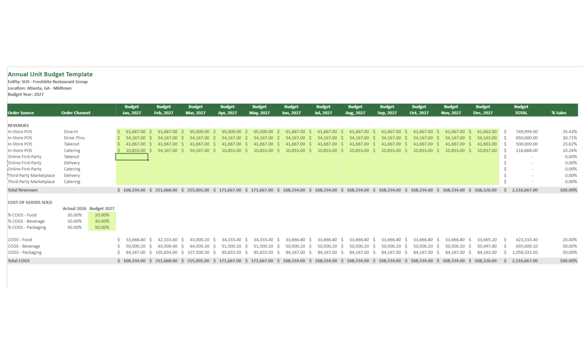 The Retail - Restaurant – Unit Budget Template in Solver is a pre-built xFP&A planning template in the Solver Template Marketplace for the retail industry.