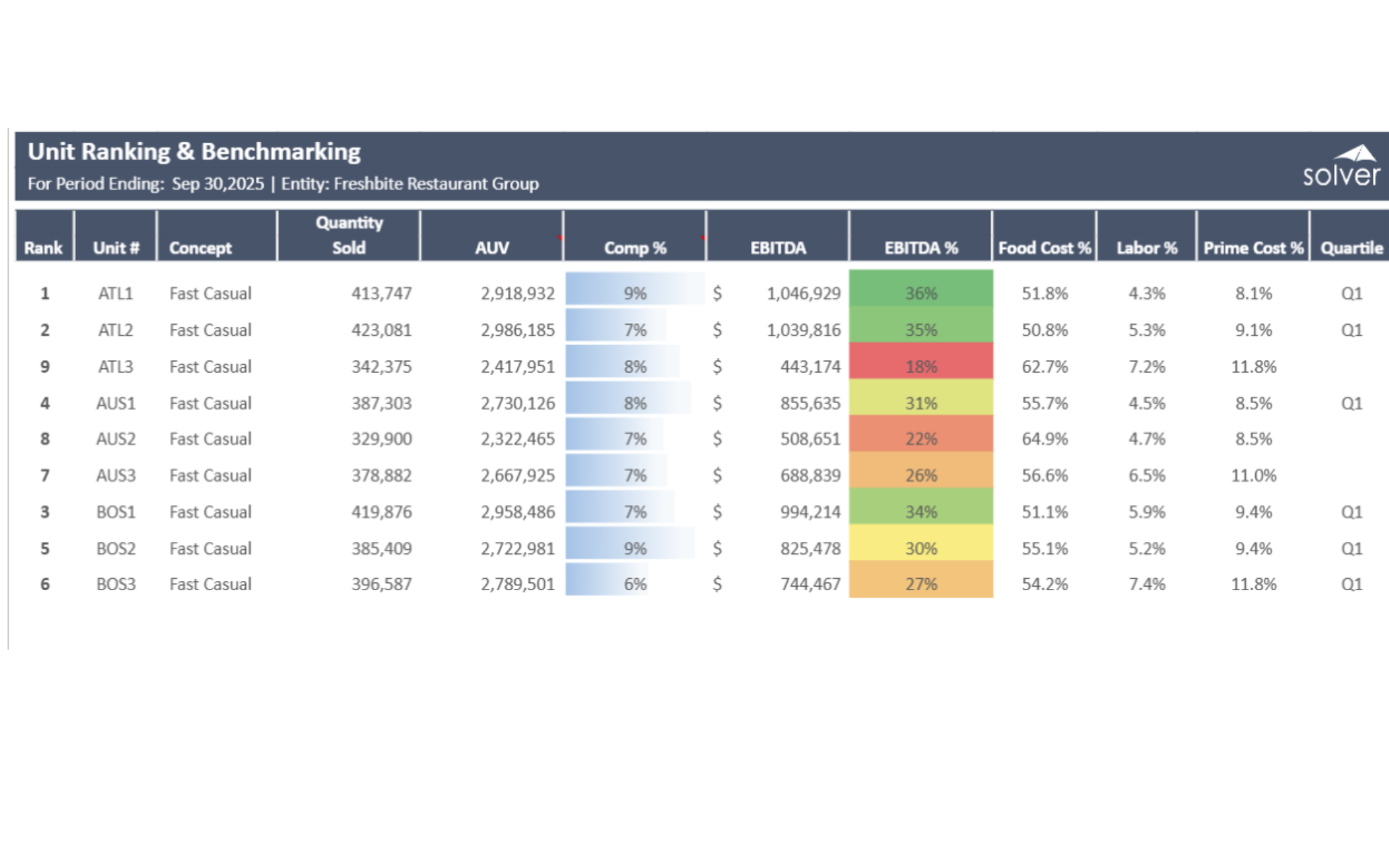 Built for multi-location restaurant groups in the retail industry, this Solver report connects ERP, POS, and operational data via the Solver Data Warehouse, delivering near real-time unit ranking and benchmarking analysis. Designed for QuickStart deployment, it supports monthly portfolio performance reviews.