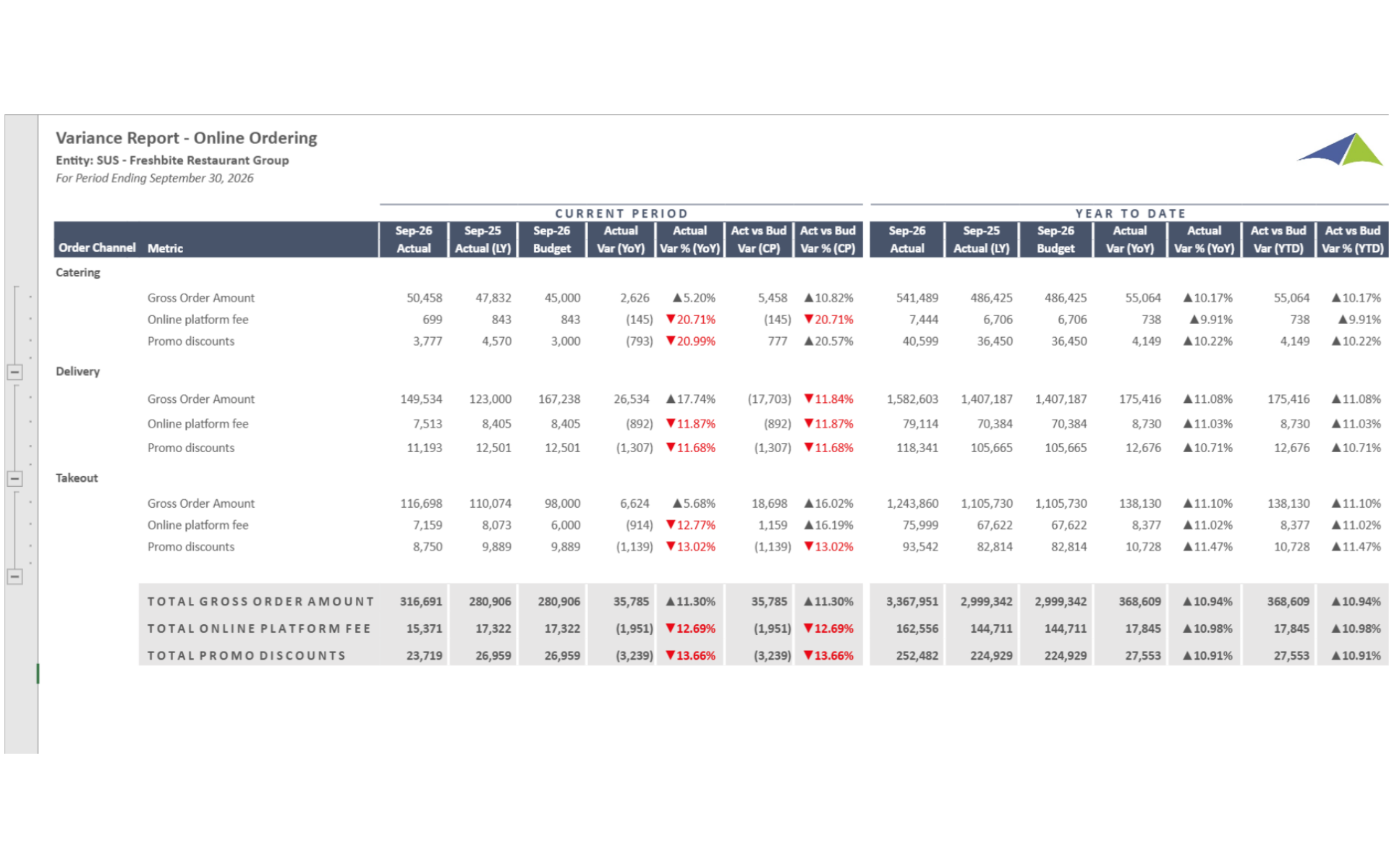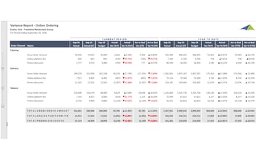 Analyzes online ordering channel variance comparing actual online order volume, revenue, and average check size to budget and prior year, enabling operators to evaluate digital ordering performance and identify locations where adoption is lagging.