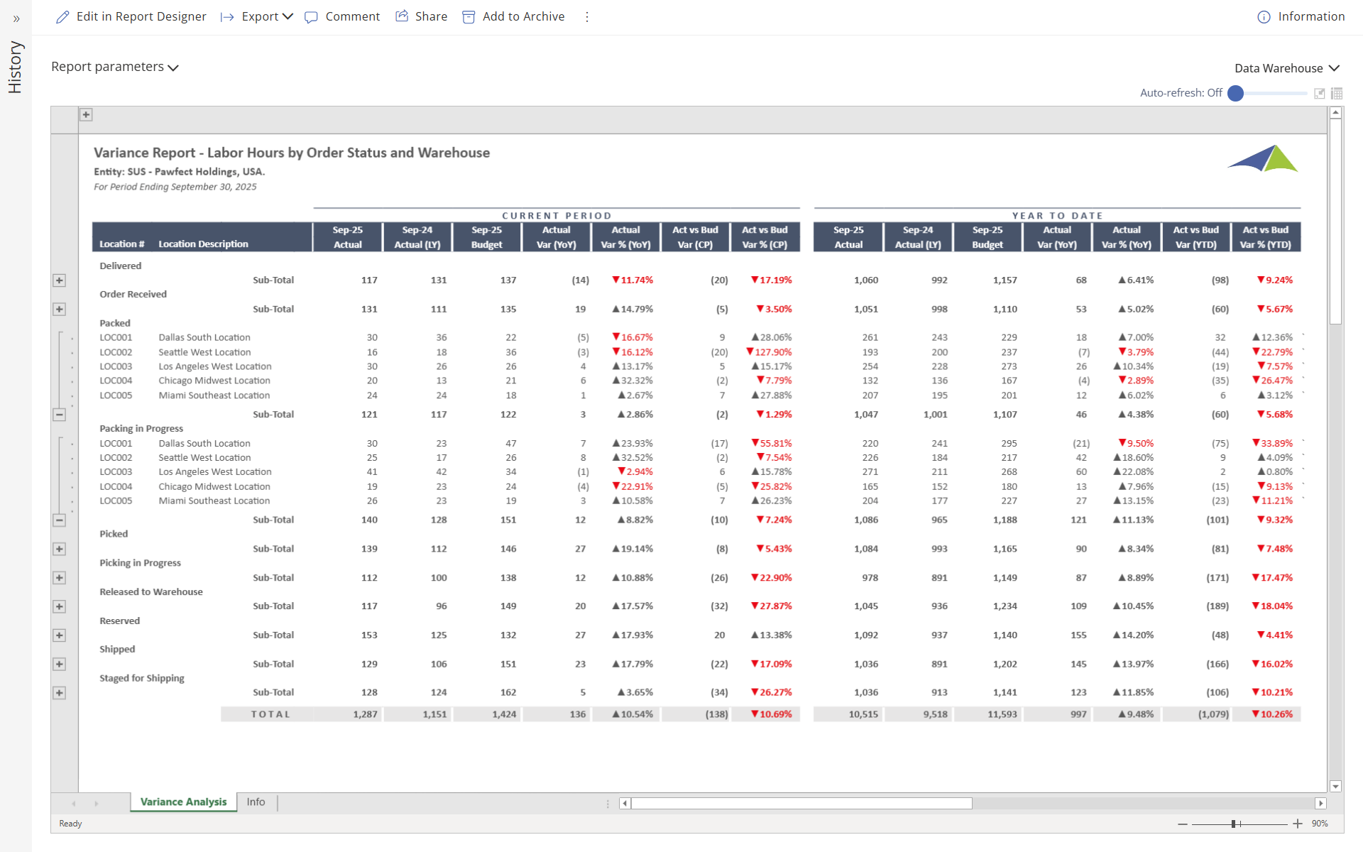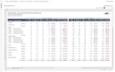 This report presents labor hours by order status and warehouse, with figures displayed for both the current month and year‑to‑date. It also includes variance comparisons against the prior year, offering insights into financial performance over time.