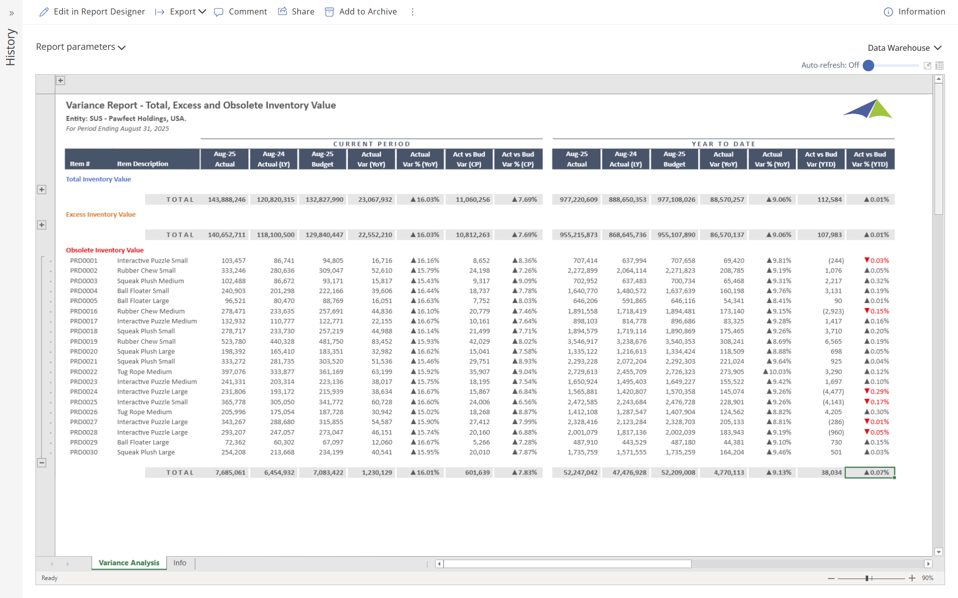 This report shows inventory values in total as well as for excess and obsolete items, with figures displayed for both the current month and year‑to‑date. It also includes variance comparisons against the prior year, offering insights into financial performance over time..