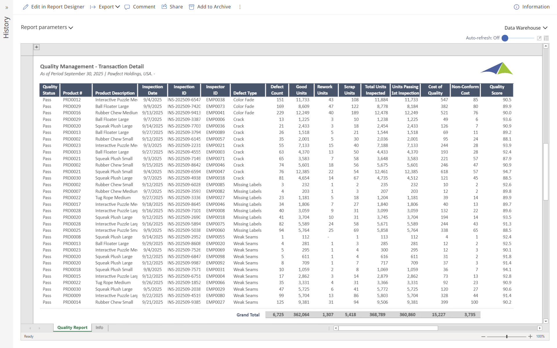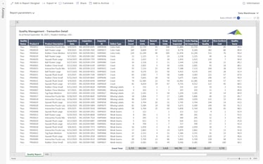 This report allows users to track quality management data with detailed insights. Each column displays a transaction field, while a comprehensive grand total is presented at the bottom, providing a clear summary.
