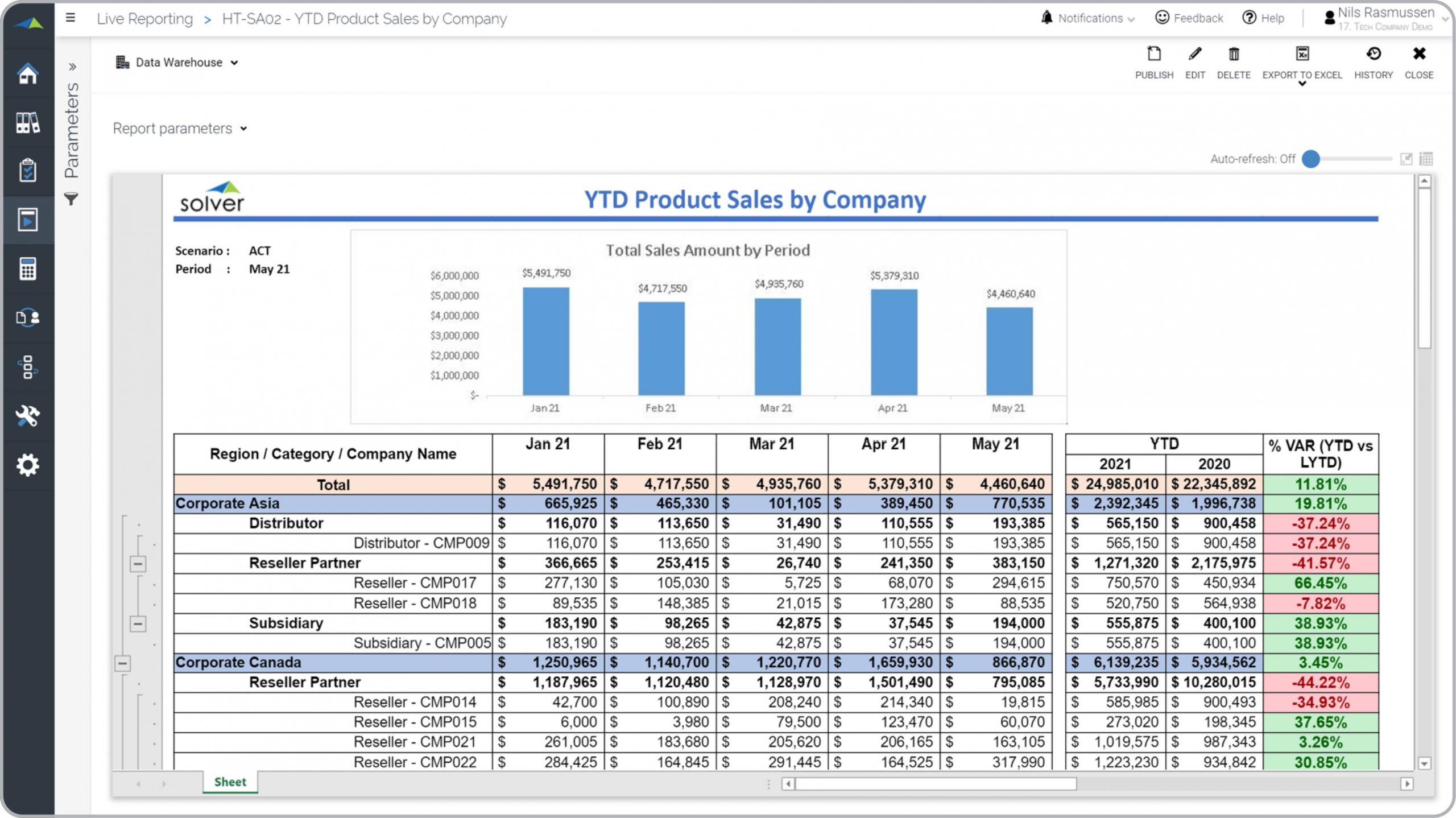 Shows monthly and YTD sales by product with reporting of variance vs prior year.